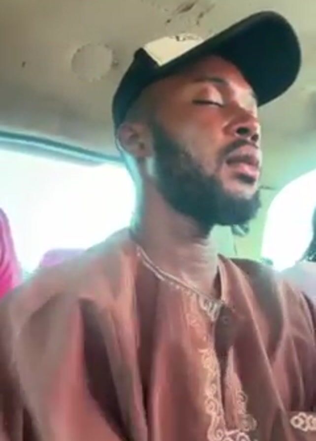 A man wearing a brown patterned shirt and a black and white baseball cap is sitting in a car. He has a beard and his eyes are closed. There are other people in the vehicle, but they are not in focus. The car's interior is light-colored and appears somewhat worn. The video is shot from a low angle.