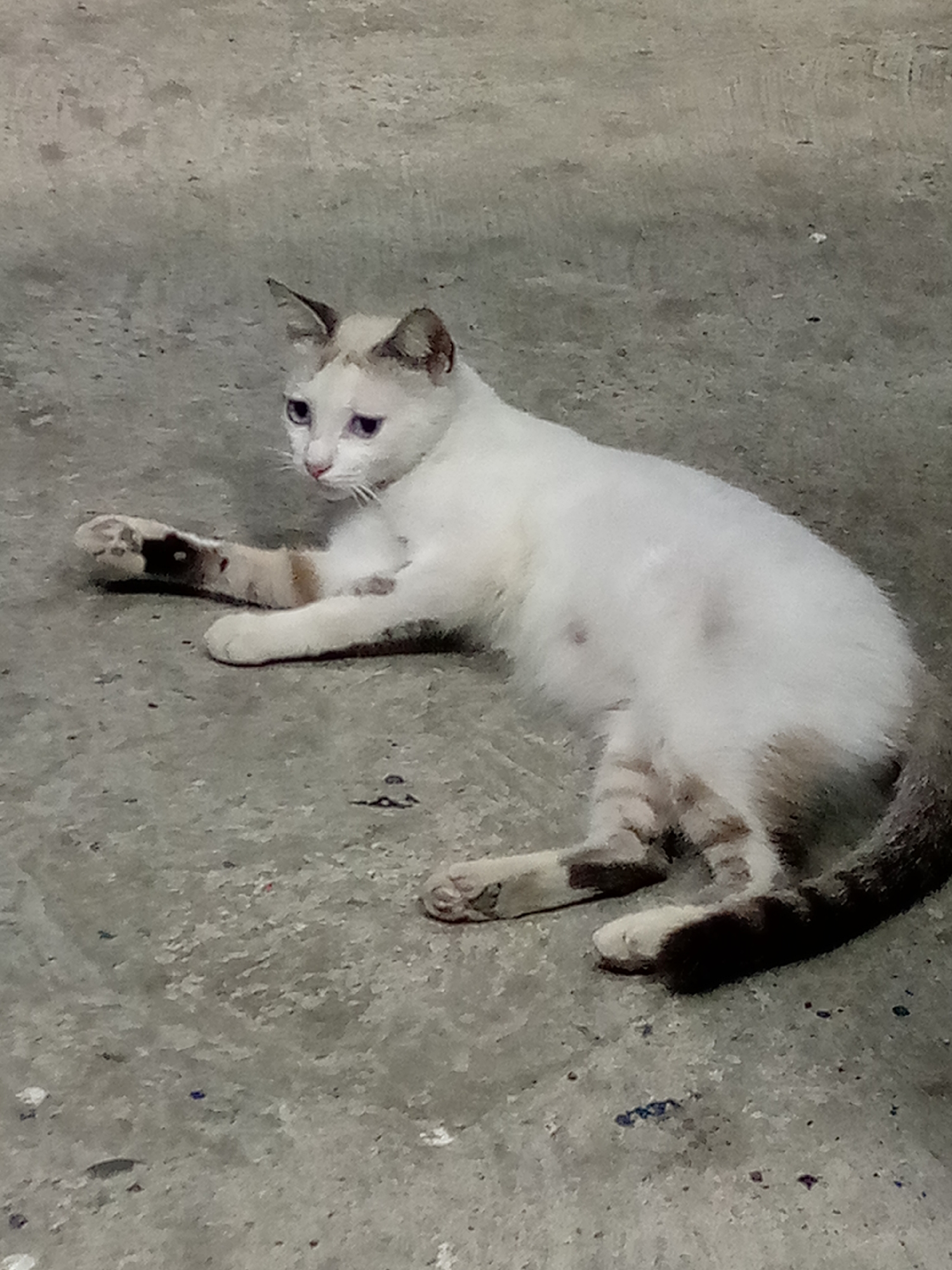 A white cat with brown markings is lying on a gray concrete surface