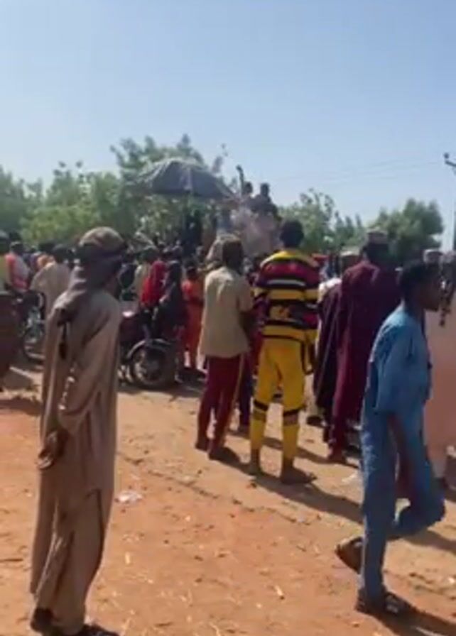 crowd of people gathered on a dirt road under a clear, sunny sky. Many of the people are wearing traditional clothing. In the background, some individuals are on an elevated platform under a dark umbrella. There are motorcycles parked along the road. The people appear to be observing the scene, and some are moving around.