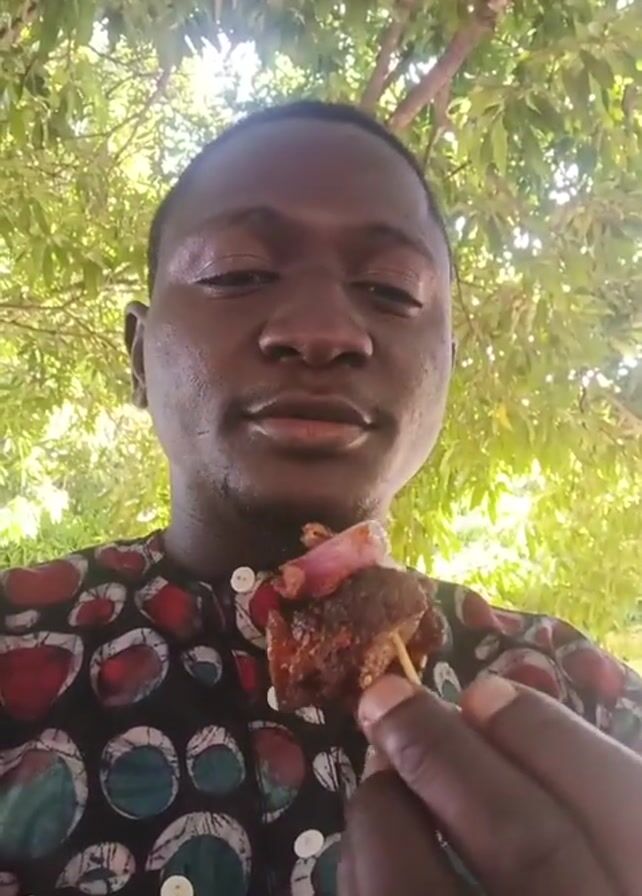 A dark-skinned man is looking directly into the camera, holding a small skewer with cooked meat on it. He wears a patterned shirt with blue, red, and white circles. He opens his mouth wide and takes a bite of the meat. The background consists of tree branches and green leaves. The lighting suggests an outdoor setting during the day.