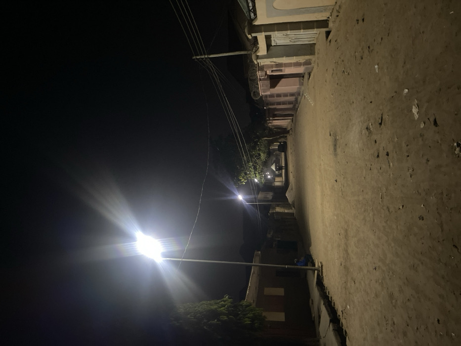 A dimly lit street at night. A bright streetlight illuminates the foreground, while another light source further down the road adds to the limited visibility. Buildings line the right side of the street, their details obscured by the darkness. Power lines stretch across the sky. The road surface is rough and uneven.