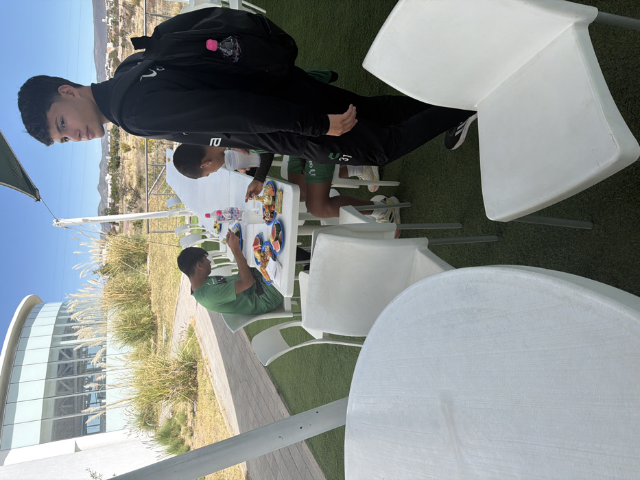 Three young males are seated at a white table, consuming food from plates. A fourth male, with a backpack and dark clothing, stands nearby. The scene is outdoors with a blue sky and building in the background. Tables and chairs are white. Some grass is present. A partially visible sunshade is also present.