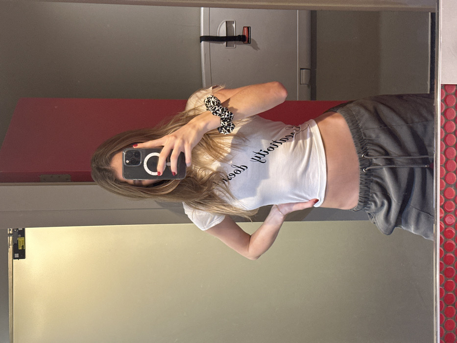 - "A woman in a mirror selfie wears a white t-shirt with writing, gray sweatpants, and a black and white hair scrunchie" by FM-6uJGr1, licensed under CC BY 4.0