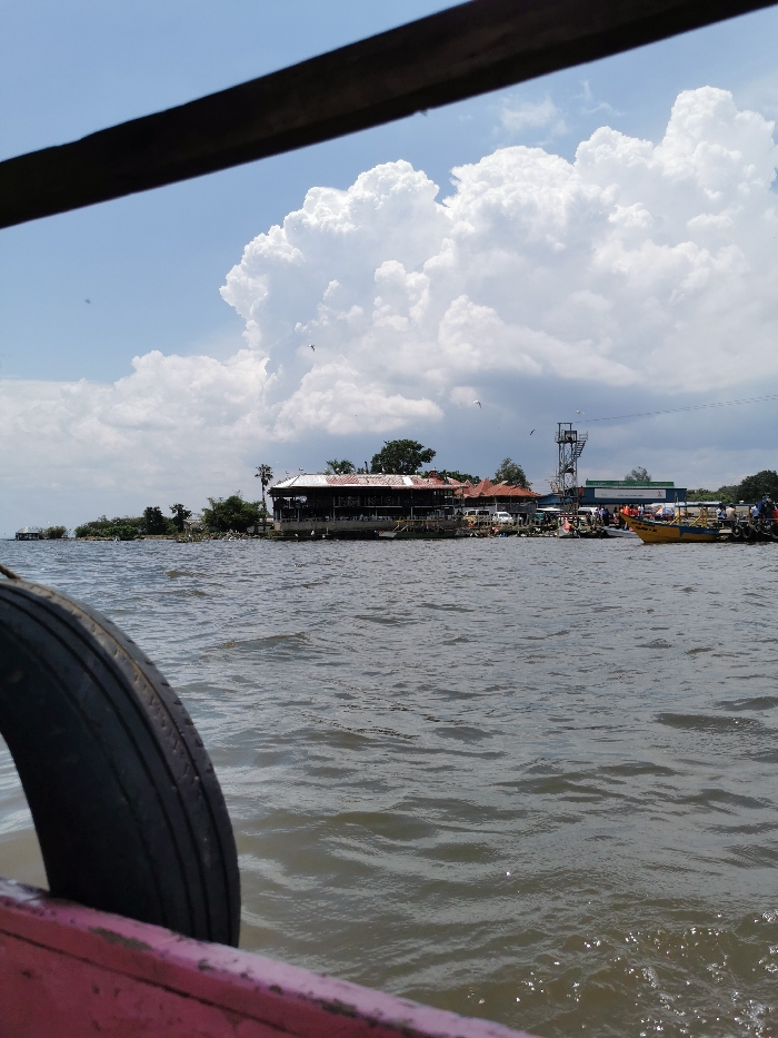 The image depicts a panoramic view of the Kisumu lakeside area in Kenya, specifically likely Dunga Bay on Lake Victoria, observed from a boat on the water. In the foreground, the lower left quadrant displays a black rubber tire, functioning as a boat fender, secured to the top edge of a pink-painted boat hull. The dark grey-green water of Lake Victoria, exhibiting moderate ripples, occupies the lower half of the frame, showing small reflections of sunlight. The midground features a developed shoreline. A prominent two-story building with a distinctive reddish-orange corrugated metal roof dominates the left-center, situated directly at the water's edge. This structure, possibly a restaurant or lodge, has numerous windows and a balcony extending along its façade. Lush green trees and dense vegetation surround the building and extend further along the landmass to the left. To the right of this primary building, a tall, metallic tower structure, possibly for observation or communications, is visible, with a green rectangular sign situated at its base. A wooden pier or dock area extends from the shore, bustling with activity. Several boats are moored or positioned near the dock; a notable yellow boat with a blue stripe is prominent on the right side. Approximately two dozen individuals are discernible on the pier and along the shoreline, appearing to be gathered or engaged in unspecified activities. White vehicles are partially visible on land near the main building. The background consists of a bright blue sky, largely filled with voluminous, white cumulus clouds. Several small white birds are observed in flight across the sky. The scene is brightly lit by natural daylight, suggesting a clear, sunny day.