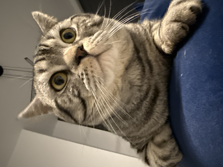 - "An indoor, close-up photograph depicts a domestic tabby cat with grey and brown striped fur, positioned with its front paws resting on a blue textile surface" by FM-rMis83, licensed under CC BY 4.0