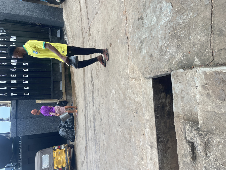 A man in a yellow shirt and black pants walks on a gray concrete surface. A woman in a purple top and striped skirt stands next to garbage bags. A yellow vehicle is behind her. A vertical opening is visible in the concrete, along the right edge of the image. Letters, "ALOR STREET TIME 6 AM LONDON," are visible on a black wall.