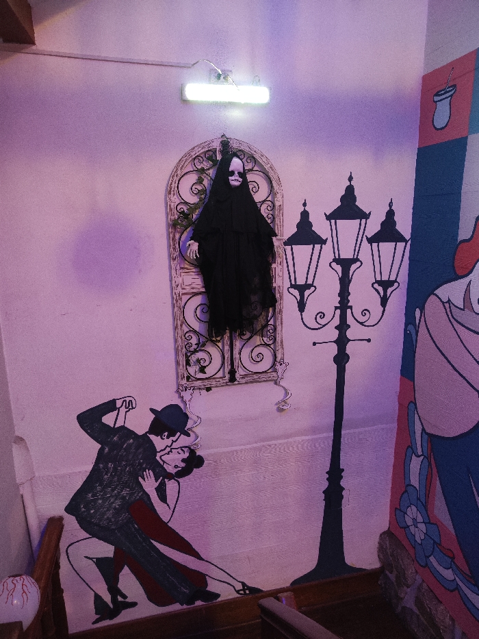 This image captures an interior wall space, likely a hallway or stairwell, in the city of Cuzco, Peru. A horizontal fluorescent light fixture is mounted high on the light-colored wall. Below it, a decorative white wrought-iron archway, adorned with some green foliage, serves as a backdrop for a suspended skeletal figure resembling the Grim Reaper. This figure has a white skull-like face, visible bony hands, and is draped in a black, flowing hooded shroud. To the right of this decoration, a large, black silhouette of a three-lantern streetlamp is painted on the wall. Below the Grim Reaper and to the left of the streetlamp, a large mural depicts two individuals in black outline: a man in a hat and suit dipping a woman in a red dress, engaged in what appears to be a tango. To the far right, a vertical section of the wall displays a colorful mural with blue, red, and white geometric patterns, featuring a stylized mate cup at its top. At the bottom of the frame, a wooden railing or banister is visible, with a white balloon bearing a red eyeball design resting on it to the left. The wall exhibits a faint purple hue, likely from ambient lighting.