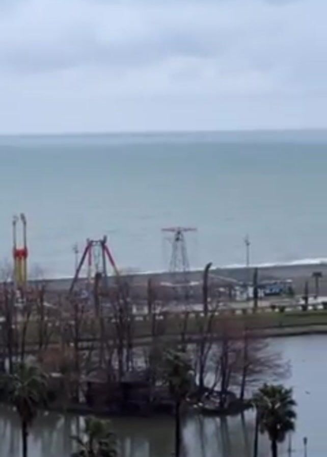 A slightly tilted medium shot opens on a cloudy day over the sea and a small city area. In the distance, the calm ocean waters stretch horizontally to the horizon, meeting a gray sky. A black shoreline runs along the water's edge. In the foreground, on the left, is a small, calm lake, where reflections of palm trees and other plants are visible. Several leafless trees dot a small island in the center of the lake. Amusement park rides are visible along the shoreline in the distance. Palm trees and a row of cars are parked along the street on the left. As the shot shifts right, a tall, modern building with numerous blue-tinted glass balconies comes into view. Lights are on in some of the apartments. The building's base is a concrete gray. The overall tone of the video is muted and somber.