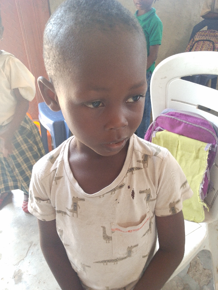 The scene depicts an indoor or semi-enclosed area in the city of Unknown, Unknown. In the foreground, a young child with dark skin and short, buzz-cut hair stands, facing mostly forward but looking slightly to their right (viewer's left) with a neutral expression. The child wears a light beige short-sleeved t-shirt patterned with crocodiles, which exhibits visible damage including a prominent hole near the right collarbone area and another below the right shoulder. In the mid-ground left, partially obscured, an individual wearing a light-colored top and a blue plaid skirt is seated on a blue plastic stool. Red footwear is visible on the concrete floor near this individual. To the right of the foreground child, a white plastic chair holds a purple and yellow backpack. Further back, behind the foreground child, a person wearing a green polo shirt and blue jeans is partially visible. The background includes a plain, light-colored wall and a segment of wooden paneling or a door on the far left. No direct interaction between subjects is evident.
