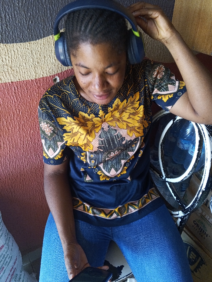 An individual is depicted in an overhead perspective within a location identified as Sabon Tasha, Nigeria. The person, an adult female with dark skin and braided hair, is wearing a navy blue short-sleeved top with yellow and green patterned designs, and blue denim jeans. She wears dark blue over-ear headphones with lime green accents; her right hand is raised, touching the left earcup. Her left hand holds a dark-colored smartphone. Her gaze is directed downwards. To her right, a black and white motorcycle helmet is visible, resting on cardboard boxes, one of which displays "ORIGIN BITTER" text. A white sack or bag with faint text is partially visible on the far left. The background consists of a textured wall with horizontal bands of dark brown/black, reddish-brown, and beige coloring.