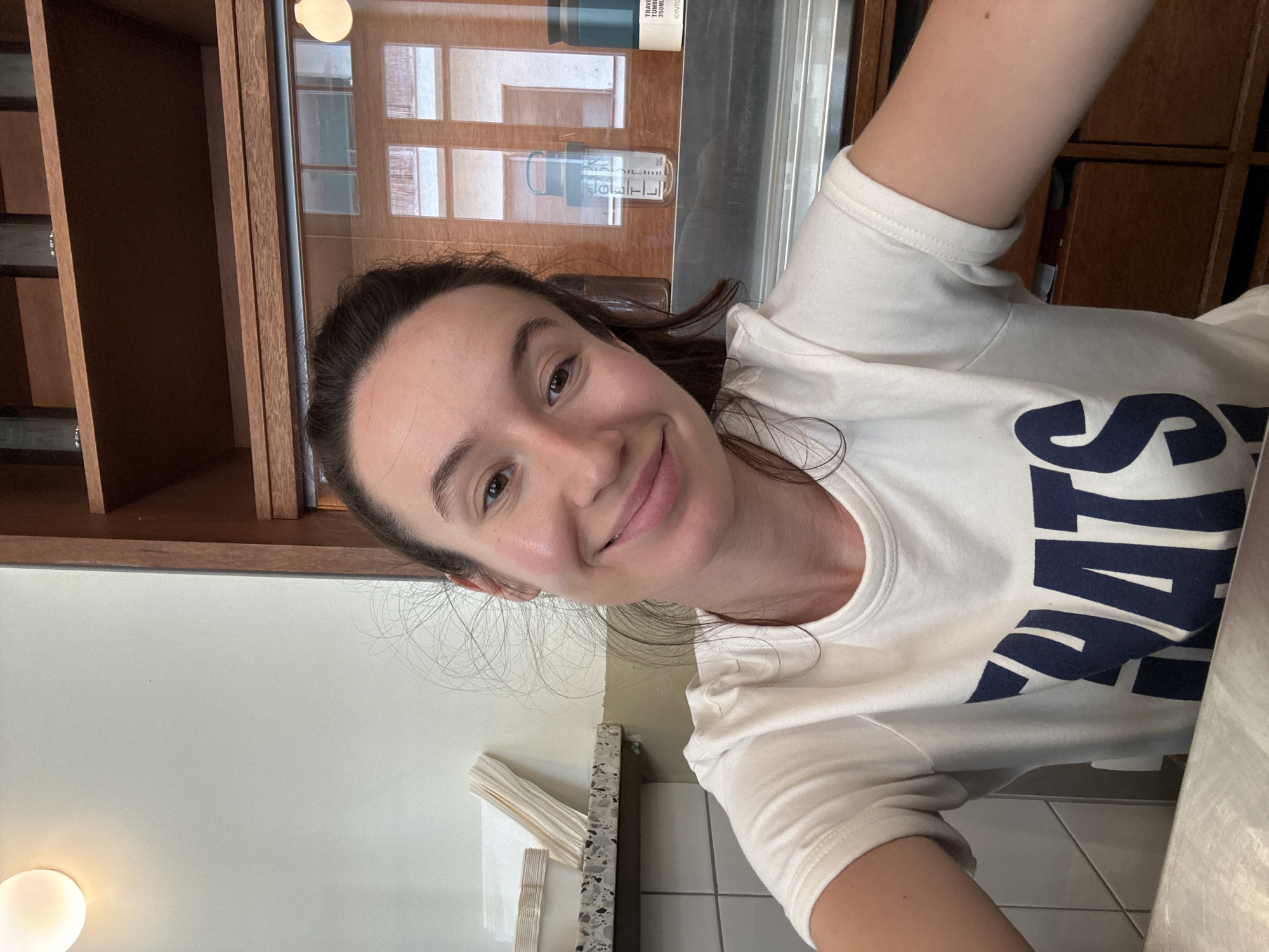 A young woman is shown in a selfie, smiling at the camera, in what appears to be a café or restaurant in Tel Aviv, Israel. She wears a white t-shirt with a navy-blue inscription, partially visible. The background features interior elements of the establishment. These include a wooden cabinet with glass doors showcasing bottles and items inside, a marble countertop with stacked napkins, white tiled walls, and a round wall-mounted light fixture. The lighting is soft and diffused, suggesting it is either a cloudy day or artificial lighting. The woman's dark hair is pulled back, and her expression is relaxed and friendly. A section of a reflective surface is present in the lower right corner, possibly the edge of a table.