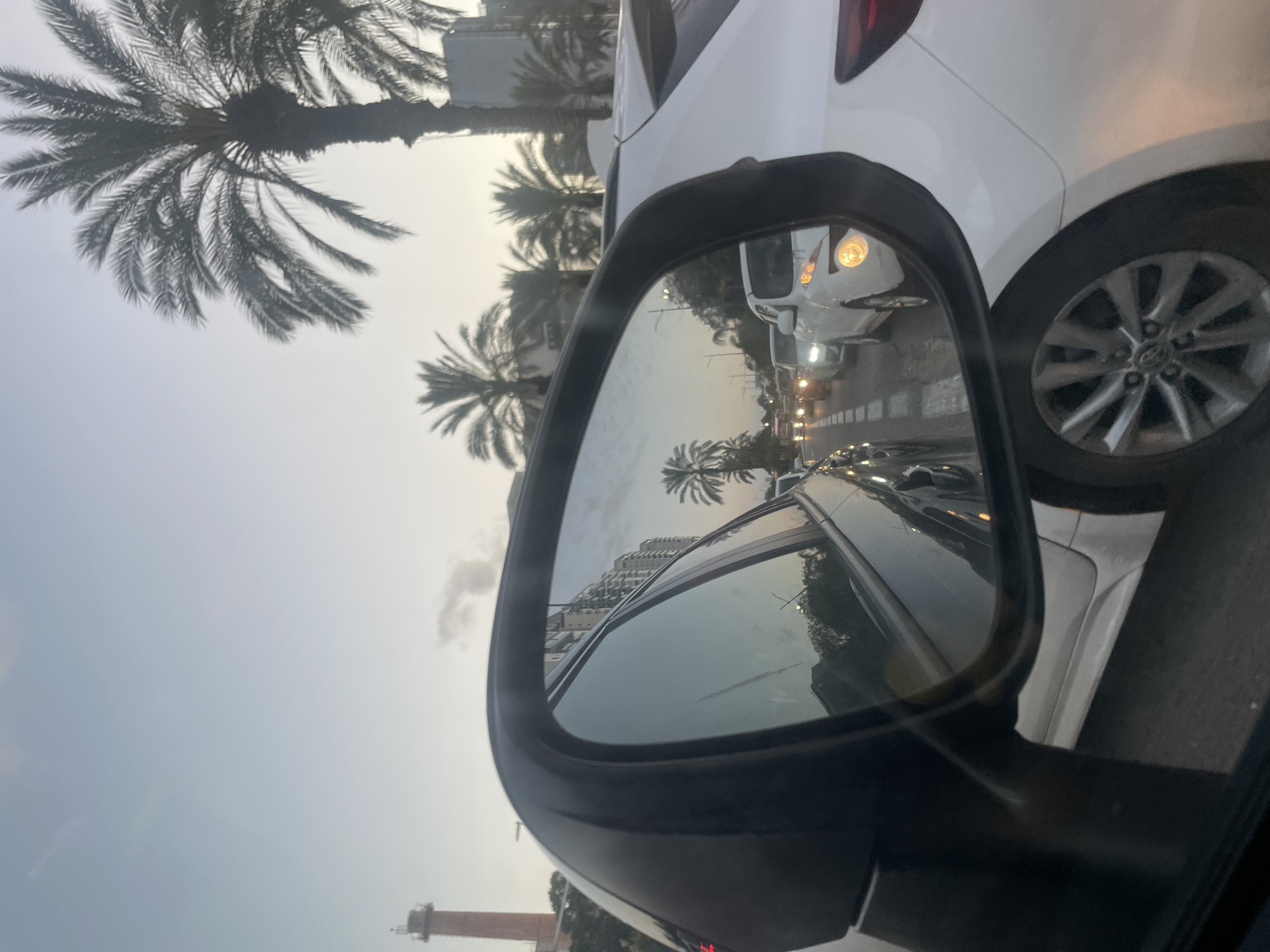 view from the side mirror of a car. In the mirror's reflection is a busy street with cars, palm trees lining the road, and buildings. To the right of the mirror is a white car. In the lower left of the image is the Petah Tikva water tower. This suggests the location is Petah Tikva, Israel.