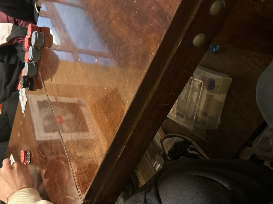 The image displays an indoor scene in Varna, Bulgaria, focused on a polished, dark brown wooden table with visible scratches and a central seam. The table's reflective surface shows a bright light source, likely a window, and a rectangular reflection, possibly a framed object. On the table's left side, a person's forearm, adorned with a light-colored bracelet, and hand are visible, holding two playing cards. Near this hand, a stack of three poker chips (two red, one black) is present. On the right side of the table, three distinct groups of poker chips are arranged: a stack of black chips, two stacks of grey/blue chips, and two stacks of red chips. A single face-down playing card or a small stack of cards is also visible on this side. Partially visible under the table are the lower legs of two individuals. On the left, a leg in dark grey or black sweatpants and a black and white sneaker is visible. On the right, a leg clad in light blue jeans is present. Resting on the floor beneath the table is a translucent plastic container with a small colorful label (featuring blue and purple elements on green), and a partially visible blue-tinted object, possibly a bottle. The immediate environment beneath the table appears to be a dark-colored floor. The arrangement of cards and chips indicates an ongoing card game.