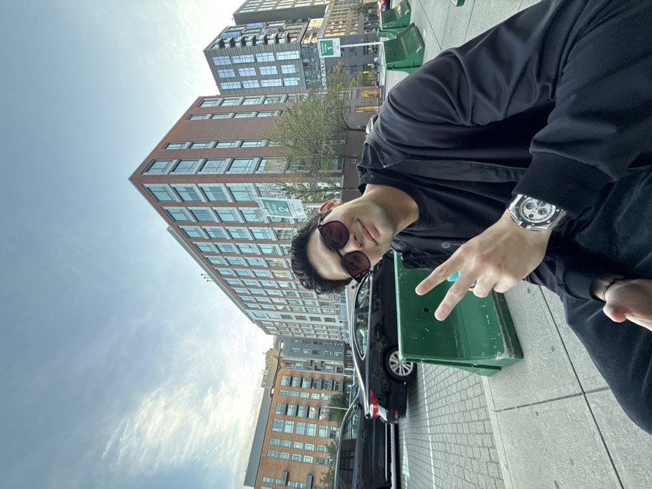 A young man is seated outdoors in a modern urban environment in Boston, United States, posing for the camera