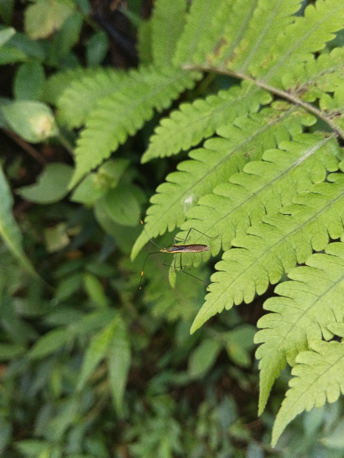 A slender, brown and tan insect with very long, thin legs rests on a vibrant green fern frond. The insect's legs have yellow markings. The fern's delicate, feathery leaves fill the frame. The background consists of blurred foliage in varying shades of green, creating a natural and lush environment. The insect blends well with the fern but is still noticeable because of the light color.