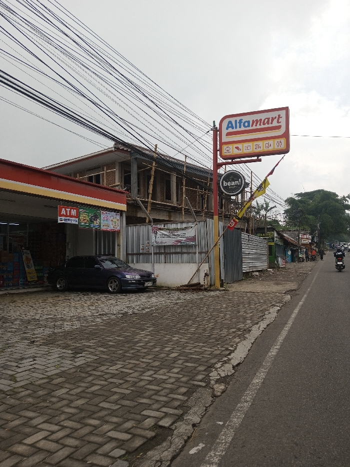 A daytime street scene in Sandamal Eliya, Sri Lanka, depicts a commercial roadside area under an overcast sky. In the foreground, a dark-colored sedan with custom alloy wheels is parked on a wet, grey interlocking brick pavement. To the left, an open-front building with a red and yellow awning displays an "ATM" sign and retail products inside. Adjacent to this, a multi-story building is under active construction, featuring bamboo scaffolding and exposed concrete/brickwork. A corrugated metal fence fronts this construction, adorned with a white banner. A tall pole stands between the parked car and the road, bearing a prominent red and white "Alfamart" sign at the top and a circular black "bean! SPOT" sign below it. Several yellow and red triangular flags are affixed to this pole. To the right, an asphalt road runs parallel to the sidewalk. A faded white line marks the edge of the road. Further down the street, on the right, multiple small shops or residences line the road. One individual on a dark scooter drives away from the viewer on the road, while several pedestrians are visible on the far sidewalk. Overhead, numerous black electrical or communication cables span across the scene.