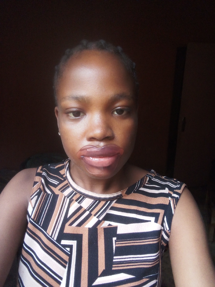 A woman with dark skin and braided hair is looking directly at the camera. She is wearing a sleeveless top with a geometric pattern of black, white, and brown stripes. She has a clear lip mask on. The background is blurry, but it appears to be an indoor setting with dark walls and a partially visible door.