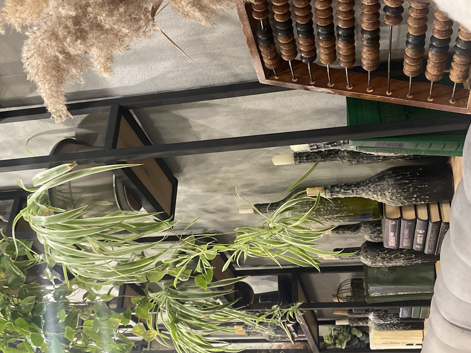 This indoor scene, located in Anapa, Russia, presents a detailed section of a decorative shelving unit against a textured grey wall. The shelving unit consists of black metal frames and light-colored wooden planks. Numerous potted plants, predominantly spider plants (Chlorophytum comosum) with variegated green and white leaves, are arranged on the shelves and cascade downwards. Other plants with green, heart-shaped leaves are also visible. In the upper right portion of the image, a large, fluffy mass of dried, light brown ornamental grass or reeds is present. The lower shelf displays a collection of items. From left to right, these include a light-colored block or book, several dark green-bound books, some upright and some stacked. A small, dark decorative birdcage is visible. Multiple glass bottles, some green and others dark-colored, stand upright; they are heavily coated with dried, light-colored wax drips and some contain white candles or corks. A stack of approximately five small, dark-covered books is horizontally placed. To the far right, a wooden abacus (schoty) with ten rows of alternating light brown and dark brown beads is prominently displayed at an angle. Additional green-bound books are partially visible behind the abacus. The blurred, light-grey upholstered edge of a sofa or bench occupies the bottom foreground of the image. No individuals are depicted in the scene.