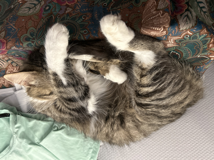 - "A domestic cat, exhibiting a brown and gray tabby fur pattern with prominent white markings on its paws and facial area, is observed in a deep sleep" by FM-KvJN53, licensed under CC BY 4.0