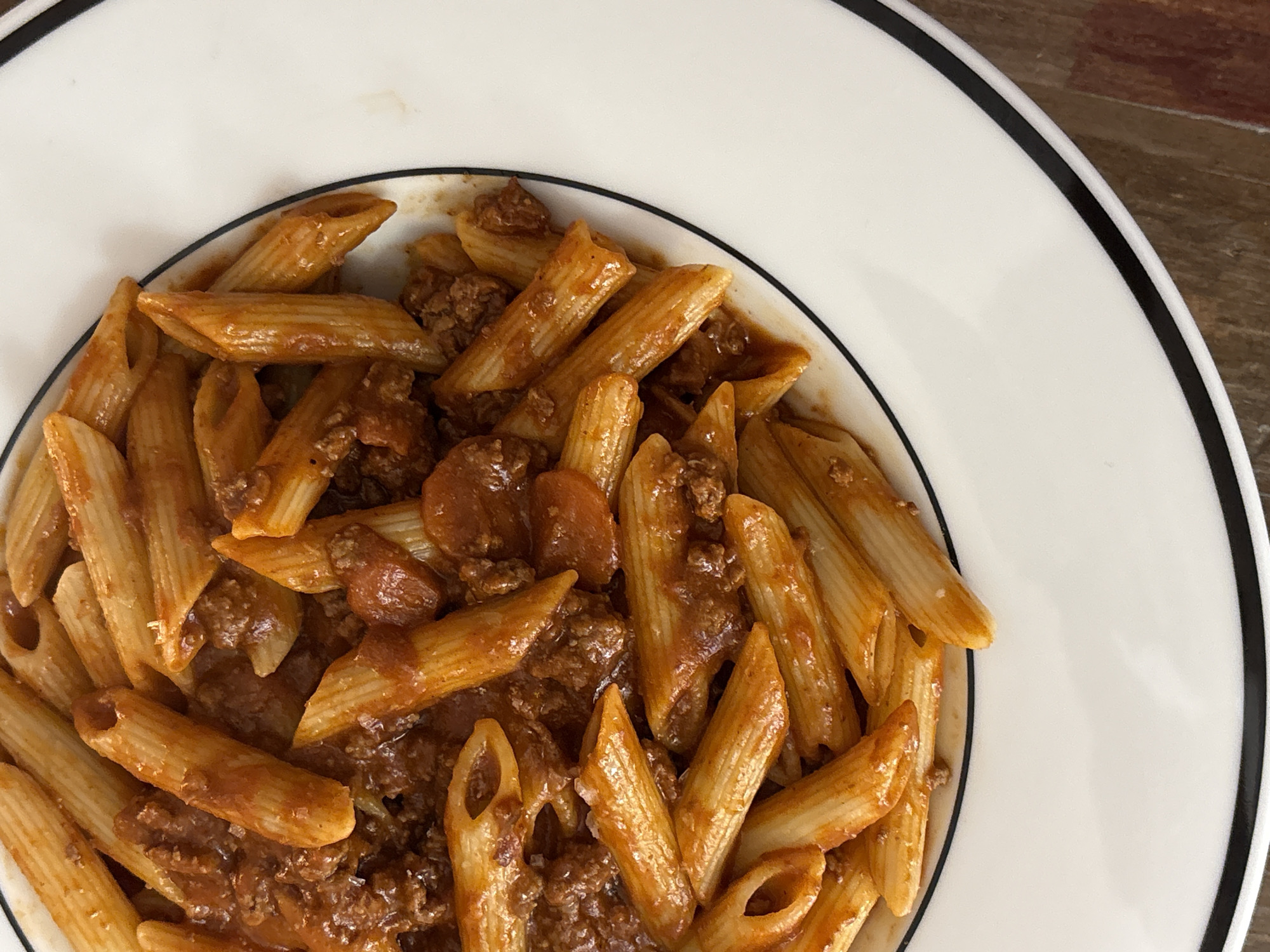 - "The image displays a close-up, high-angle view of a serving of penne pasta with a rich, reddish-brown meat sauce, likely bolognese, occupying the majority of a white ceramic plate" by FM-iUTA73, licensed under CC BY 4.0