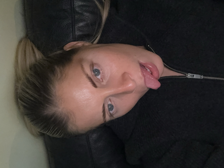 A woman with light blonde hair pulled back in a ponytail lies on a black leather surface, possibly a couch. She wears a dark, zip-up sweater. Her head is slightly tilted, and her face is visible. The woman's mouth is open with her tongue sticking out. She has fair skin, blue eyes, and distinct eyebrows. The lighting is soft and somewhat dim, giving the image a subdued tone.