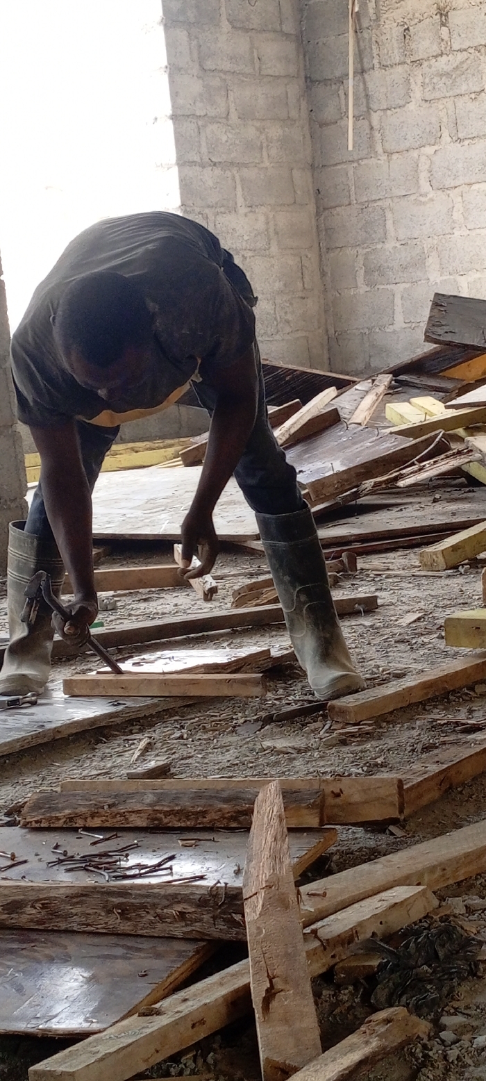 A person wearing rubber boots is working on a construction site, surrounded by scattered lumber and debris. The individual is bent over, using a tool, possibly a hammer or nail puller, on a piece of wood. Nails are visible on some of the boards. The walls of the building under construction are constructed of cinder blocks. The scene conveys an image of ongoing labor and construction work.