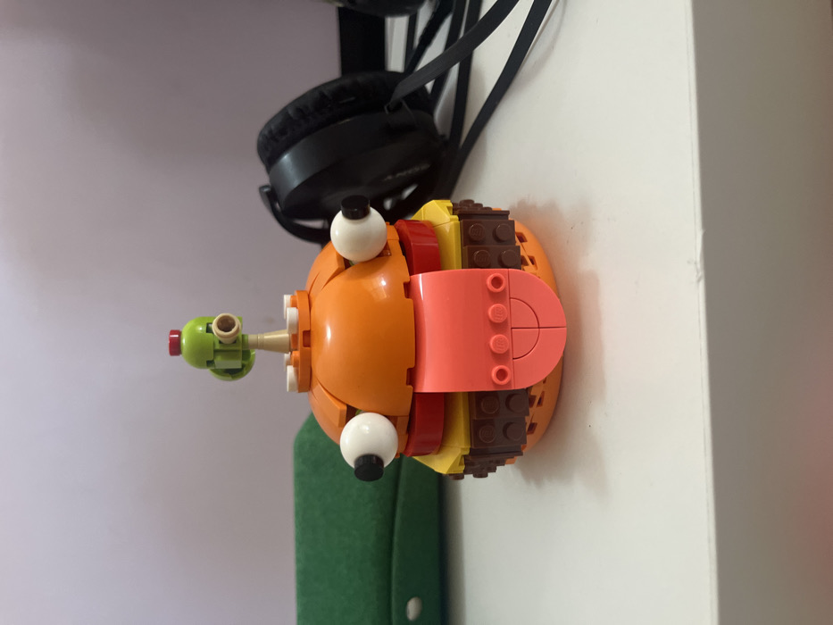 A Lego Krabby Patty rests on a white surface. Above it, black headphones hang. The Krabby Patty includes orange buns, white eyes, brown patties, red tomato slices, yellow cheese, and a green pickle with a red tip. A green pencil case is seen behind it. The background includes a white wall and headphones hanging from a shelf.