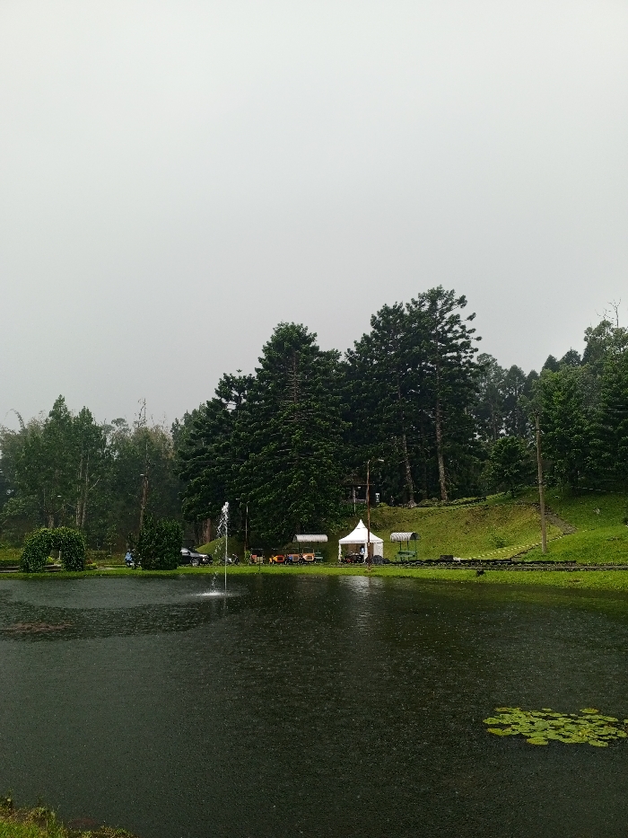A dark lake with a fountain is in the foreground, reflecting the rainy sky. Beyond the lake, tall, dark green trees line a grassy hillside. A white tent and covered seating area are situated on the bank. The scene is overcast and slightly hazy, suggesting a damp or rainy day. Lily pads float on the far right corner of the lake.