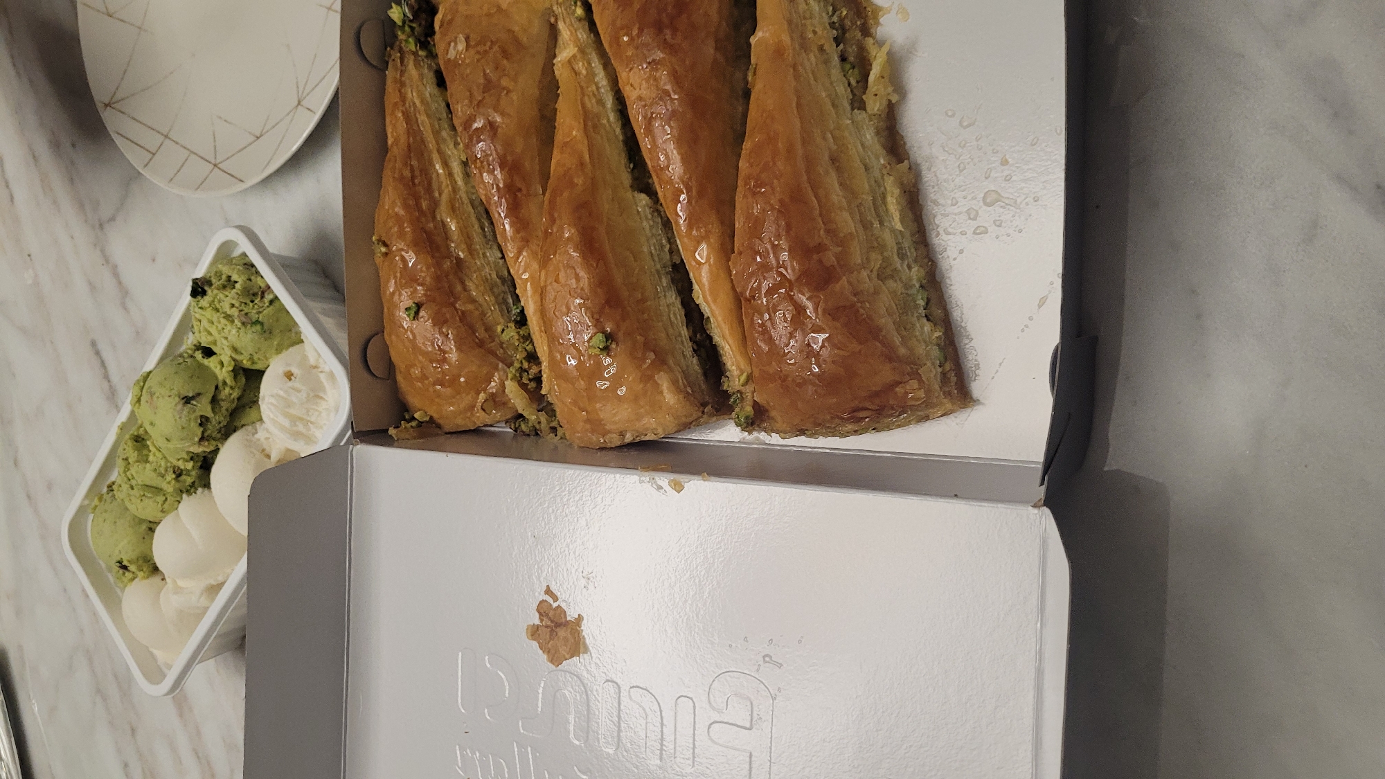 - "box of baklava, a container of ice cream, and a plate on a marble surface" by FM-eKlas2, licensed under CC BY 4.0