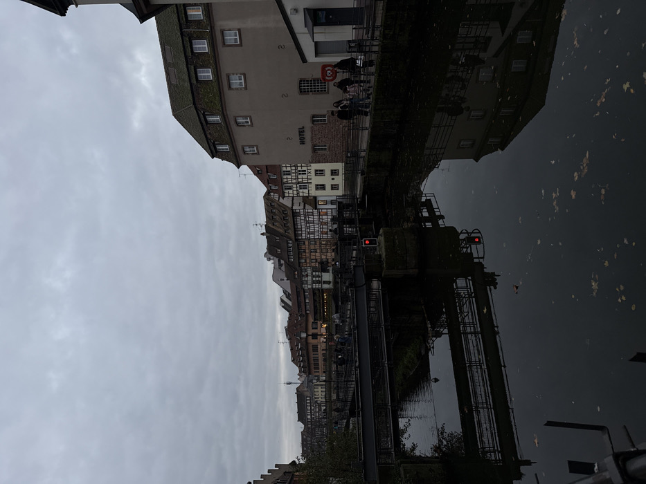 The image displays a canal scene in Strasbourg, France, specifically depicting an area consistent with the Petite France district. The sky is entirely overcast, presenting a uniform grey backdrop. In the foreground, a dark canal flows, its surface reflecting the surrounding structures and a red light. Numerous fallen, light-colored leaves are scattered across the water. A dark metal pedestrian bridge, indicative of a moving lock bridge, spans the canal horizontally. Several indistinct figures are visible walking across this bridge from left to right. To the right of the bridge, a stone structure, part of a lock system, features an illuminated red signal light. Along the right canal bank, approximately five to six individuals are seen walking or standing on a paved pathway behind a dark metal fence. Their faces and specific actions are indistinct due to distance and lighting. Immediately behind them, a large, light-colored building with a dark, multi-faceted roof is prominent. The word "HOTEL" is visible in dark letters on its facade, above a section of exposed brickwork. Multiple small, evenly spaced windows with white frames punctuate the building's walls. A smaller, white-walled building with a dark entrance adjoins the hotel to the right. Across the canal, a continuous row of traditional multi-story European buildings extends into the background. Many of these buildings exhibit half-timbered construction, featuring white walls with dark wooden beams. Their facades display various hues, including white, cream, and brown, all topped with dark, sloped roofs. Trees with sparse foliage are visible on the far left bank of the canal.