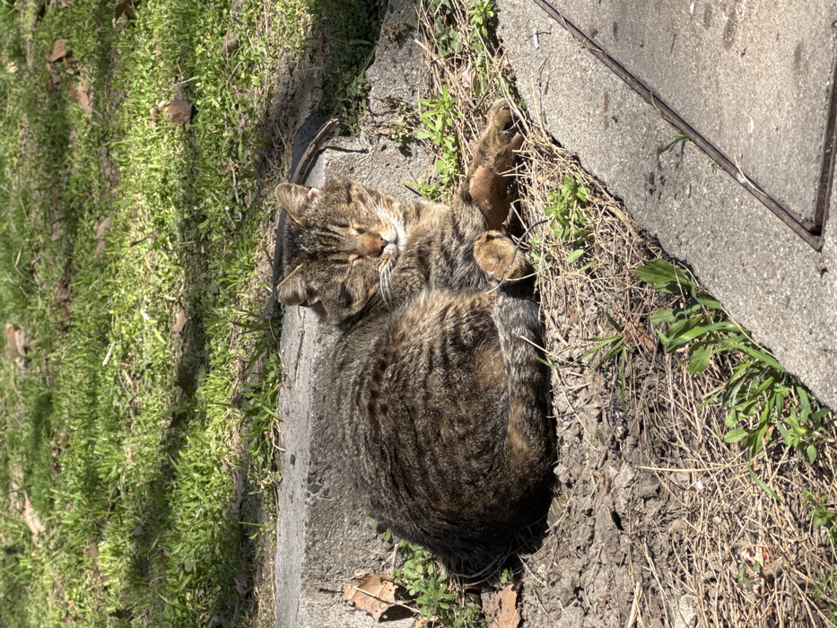 - "A brown and black tabby cat is observed resting on a patch of dry soil and sparse vegetation, eyes closed, appearing to be asleep, in Plovdiv, Bulgaria" by FM-ehgx42, licensed under CC BY 4.0