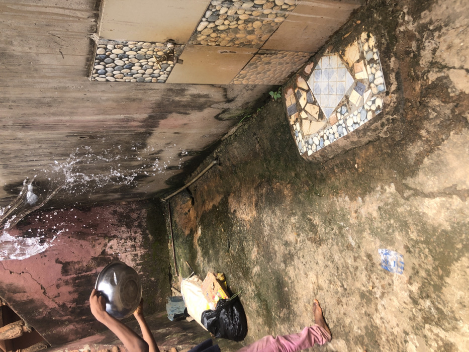 This image captures an outdoor utility space in Nkwelle, Nigeria. A person, whose lower legs in pink trousers and bare feet are visible on the left, holds a stainless steel bowl upwards, actively intercepting a stream of water splashing from an unidentifiable elevated source. The concrete ground is wet, stained, and shows significant organic growth, consistent with prolonged moisture exposure. The scene is enclosed by two weathered walls forming an interior corner. The left wall is reddish and rough-textured, with an ornate top section partially visible. The right wall is grey, marked by prominent vertical dark streaks indicative of water runoff. A section of the right wall is tiled; it features light-colored rectangular tiles and decorative mosaic patterns constructed from rounded pebbles and broken ceramic pieces. A brass-colored spigot is affixed to this tiled section. Below the spigot, at the base of the wall, is a raised, tiled platform adorned with a central blue and white checkered pattern surrounded by various ceramic fragments and pebbles. A narrow pipe runs horizontally along the base of the right wall on the ground. Miscellaneous debris is present on the concrete floor: a black plastic bag, a white bag, and cardboard pieces are situated near the person's feet. A small blue and white wrapper lies discarded on the wet concrete in the foreground.