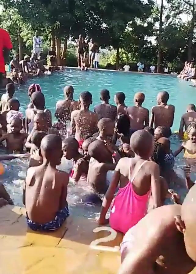 A group of approximately 40 children of various ages, mostly Black, are in and around a rectangular pool