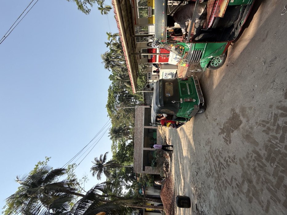 The image depicts a street scene in the city of Bhola, Bangladesh, at the coordinates 22.672 latitude and 90.656 longitude. The street is unpaved, and dirt is visible on the ground. On the left side of the road, there is a partly constructed brick building with windows and a metal door. There are two men in the street, one of whom is walking away from the camera and the other is standing still, facing the camera. On the right side of the street are two parked auto rickshaws, both of which are green. The first one is parked on the side of the road with three people inside. The second auto rickshaw is parked on the opposite side of the street with a single person inside. The auto rickshaw is facing the camera with its rear side facing the right. The background includes trees, a clear sky, and a partially visible roof with a sign that reads "LPG". The scene is sunny and the weather appears to be pleasant.