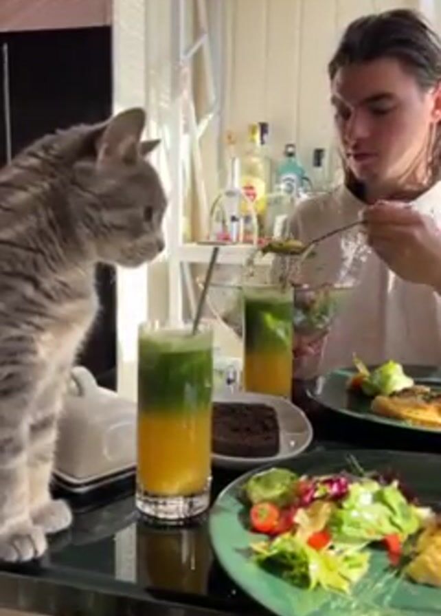 A gray tabby cat stands on its hind legs at the corner of a glass-topped table, intently sniffing the straw in a tall glass of layered green and orange juice. A young man with shoulder-length dark hair sits on the other side of the table, eating a salad from a clear glass bowl with a fork. Two green plates of salad and an omelet, as well as a small plate with a piece of chocolate cake, are also on the table. Another glass of the layered green and orange juice sits beside the cat. The background shows a portion of a kitchen with shelves holding bottles and other kitchen items.