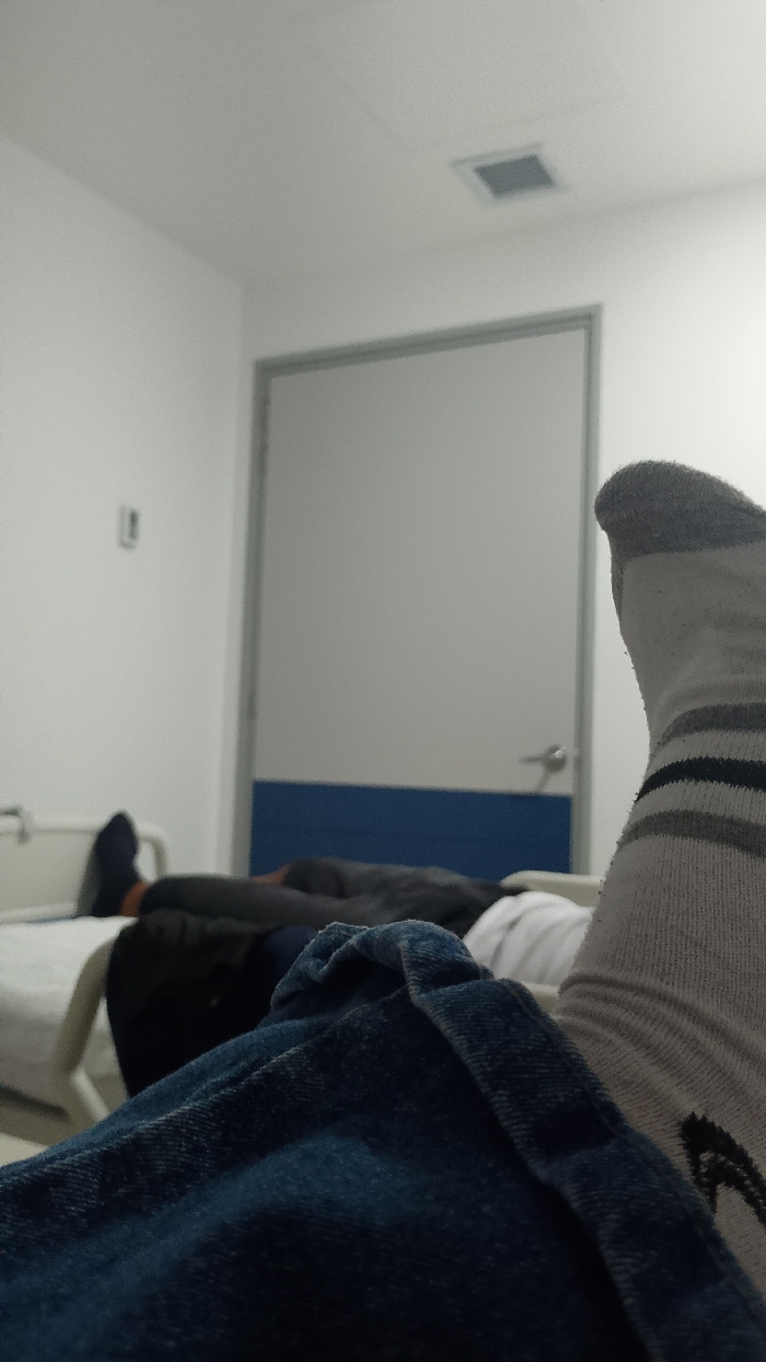 patient's perspective from a hospital bed. A striped sock-clad foot and denim-clad leg are in the foreground. In the blurred background are another person lying on the same bed, and a closed white door with a blue stripe at the bottom. The walls are white and an air vent is visible in the ceiling. The overall impression is one of sickness and isolation in a clinical setting.