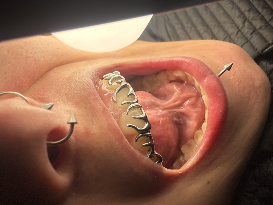 A close-up, illuminated view captured in Sofia, Bulgaria, depicts the lower facial region of an individual, specifically the nose, mouth, and chin. The subject's mouth is open, prominently displaying a custom-fitted, silver-colored dental grill on the upper teeth, designed with a distinct flame or wave pattern. The natural teeth beneath the grill and the lower teeth are visible. The tongue is partially retracted within the oral cavity. A silver-colored circular barbell piercing with conical ends is present in the nasal septum. Another silver-colored piercing, a horizontal labret with a single conical end, protrudes from the lower lip/chin area. The lips are parted and appear moist. The immediate background on the lower right is dark and textured, while a bright, diffuse light source is visible on the upper right side, illuminating the scene.
