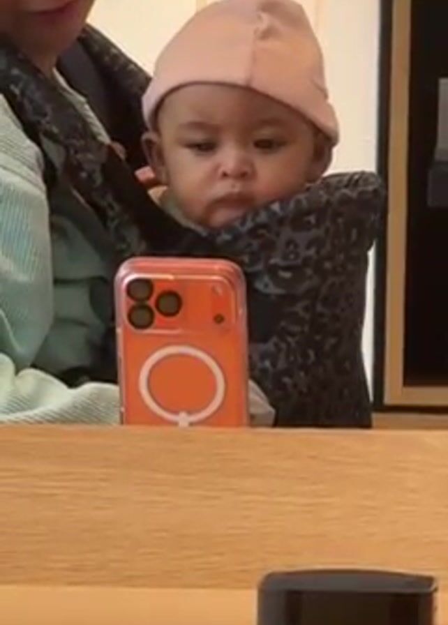 A woman is standing in what appears to be an Apple store holding a baby in a carrier. The baby is wearing a light pink beanie and looking directly at the camera with a serious expression. In front of them, on the wooden countertop, is a phone in an orange case propped up, and to the right of that, an Apple TV device. The woman is wearing a light green jacket. The lighting in the store is bright.