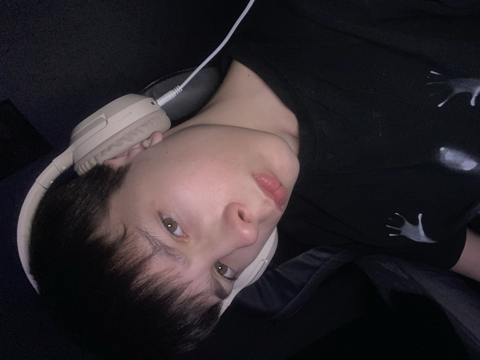 A young male individual, presumed to be in Andreyevo, Russia, is depicted in a close-up, dimly lit indoor setting. He has short, dark brown hair with bangs and light brown eyes. His expression is neutral with slightly parted lips. He is wearing a black crew-neck t-shirt featuring multiple white or light grey stylized hand-like graphics. Over-ear headphones, light beige or off-white in color, are worn over his ears, with a white cable extending downwards from the right earcup. The background is uniformly dark, with a glimpse of a dark, possibly upholstered, surface behind his left side. The individual is looking directly into the camera.