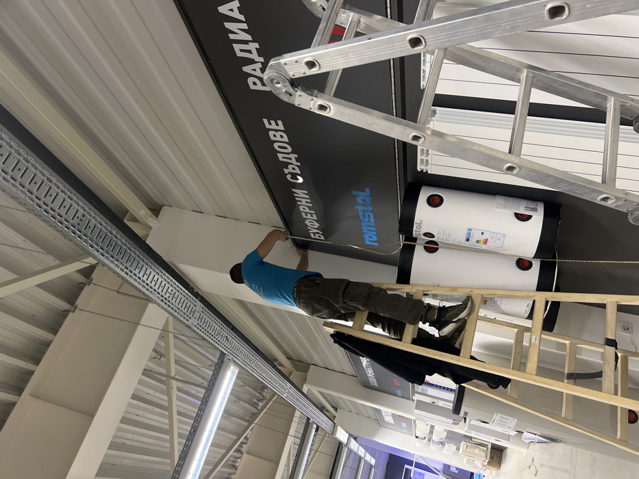 The scene depicts the interior of a commercial establishment, specifically a Romstal heating and plumbing supply store located at bul. "Съединение" 88, Haskovo, Bulgaria. One adult male, dressed in a light blue t-shirt and dark green cargo pants, is standing on the fourth rung of a light wooden A-frame ladder. He is actively applying a metallic strip along the upper edge of a dark grey wall-mounted sign. The sign displays white Cyrillic text reading "БУФЕРНИ СЪДОВЕ РАДИА" (Buffer Tanks Radia...) and the blue "Romstal" brand logo. Below the sign, two white cylindrical Romstal-branded buffer tanks or water heaters, each bearing an energy efficiency label, are displayed. To the right, multiple white panel radiators are vertically arranged. An aluminum extension ladder is partially visible on the right side of the frame, while a black jacket hangs on the wooden ladder. The building's interior features a high ceiling with white corrugated metal panels, exposed support beams, fluorescent lighting fixtures, and a suspended perforated metal cable tray system. The floor is light-colored and partially visible.