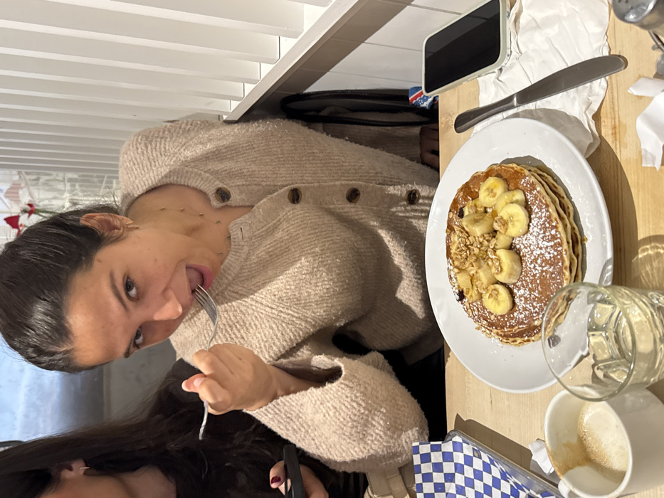 The scene depicts an interior view of an unidentified breakfast or brunch restaurant located in Atlanta, United States. In the foreground and central to the image is a female, appearing to be in her early to mid-20s, with dark hair pulled back. She is wearing a light beige or off-white textured knit cardigan with prominent brown buttons down the front. She is captured mid-action, looking directly at the camera with her mouth open, holding a silver fork towards her mouth as if about to eat. To her left, partially obscured, is another individual, also female, with dark hair. Only her upper body and left hand, holding a dark-colored smartphone with dark red nail polish visible on her fingernails, are discernable. On the light-colored wooden table in front of the main subject is a white circular plate holding a stack of three golden-brown pancakes. The pancakes are topped with sliced bananas, granola, a dusting of powdered sugar, and a few small, dark fruit pieces, possibly blueberries. To the left of the plate, a white ceramic mug containing a latte or similar coffee beverage with foam is present, alongside a clear glass filled with water. To the right of the plate, a silver knife rests on a crumpled white paper napkin. A dark-colored smartphone with a light-colored speckled case is also on the table, to the right of the knife. A metal tray or basket lined with a blue and white checkered paper is visible on the far left of the table. The background features a wall with vertical white paneling or slats on the right side. Behind the main subject, a lighter-colored wall is visible with a subtle red floral element near the upper right corner. The lighting appears to be bright and even, consistent with an indoor restaurant setting.