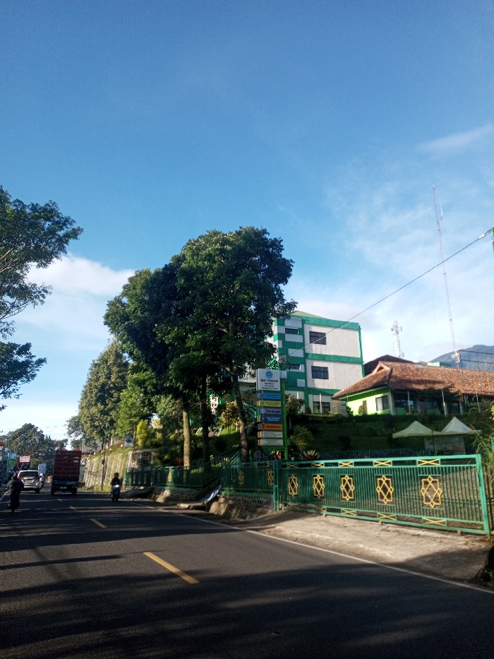The image depicts an outdoor, daytime scene of a paved road flanked by buildings and dense vegetation under a clear blue sky. The location is identified as Cibalong, Garut Regency, Indonesia, based on a visible sign reading "SMA 1 CIBALONG" and "Kabupaten Garut" near the center-right, contradicting the prompt's specified location. The sky is predominantly clear blue with minimal, wispy white clouds visible near the horizons. Strong, direct sunlight casts long shadows across the asphalt road, indicating a low sun angle. The road surface is dark, with a faded single yellow line partially visible in the center-left. On the right side of the road, a green metal fence with repeating yellow geometric patterns runs along the edge of an elevated property. Behind this fence, several large, dark green trees are prominent. Further back, a multi-story building, primarily white with horizontal green banding, stands. This building is identified as "SMA 1 CIBALONG" by a vertical multi-panel signpost positioned in front of it. To the right of this taller structure, a smaller, single-story building with light green walls and a distinctive brown, sloped tiled roof is visible. A tall, thin metal communication tower is partially visible in the distant background on the far right. Overhead power or utility lines stretch across the upper portion of the frame. On the left side of the road, a line of tall, dark green trees extends into the distance, behind a stone or concrete retaining wall. The road itself shows vehicular and pedestrian traffic moving away from the viewer. A person dressed in dark clothing is walking on the far left edge of the road. Further down the road, a dark-colored light truck with a brown cargo bed is visible, followed by a lighter-colored car. Closer to the center of the road, a person on a motorcycle, appearing as a dark silhouette, is also moving away.