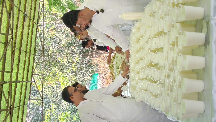 A group of people in white shirts are near a large table filled with clear plastic cups filled with a white liquid. Some of the people are handing out the cups of liquid. The setting appears to be outdoors, with trees and a green roof structure visible in the background.