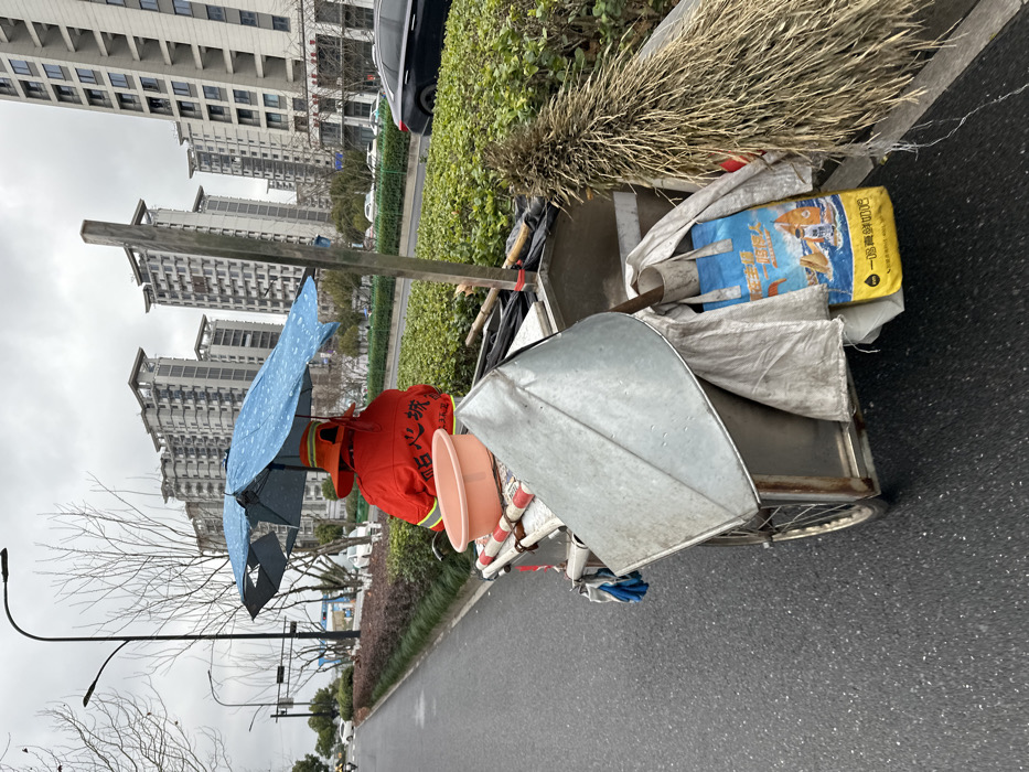 The image depicts an urban street scene in Xihu District, China, under an overcast sky. A single individual, seen from behind, is seated on a three-wheeled utility cart positioned on the edge of an asphalt road. The individual is wearing an orange uniform jacket with visible Chinese characters and an orange wide-brimmed hat. A blue umbrella, speckled with what appear to be raindrops or a pattern, is attached to the cart, providing cover over the individual. The utility cart, constructed of metal, contains various items. An orange plastic basin rests on the forward section. A large, galvanized metal scoop or dustpan is angled on the cart's bed. Attached to the right side of the cart is a substantial straw broom. A blue and yellow reusable shopping bag, featuring images of fish and a lighthouse along with Chinese text, hangs from the cart's side. White canvas or tarp material covers other contents within the cart, and blue and white gloves are visible hanging from its frame. To the left of the cart, the asphalt road extends into the distance, bordered by a strip of green shrubbery and bare-branched trees. Streetlights are visible further down the road. To the right of the cart and beyond the shrubbery, a multi-lane road with vehicular traffic, including a dark sedan, is present. In the background, numerous modern, multi-story residential buildings with concrete facades dominate the skyline.