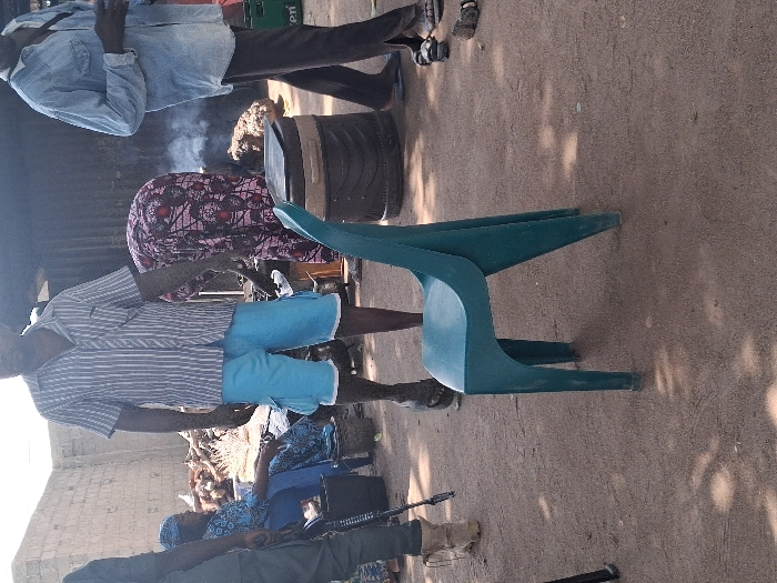 The scene depicts an outdoor area in Wukari, Nigeria, characterized by unpaved, sandy ground under bright daylight. A teal plastic monobloc chair stands in the foreground, facing right. Directly behind the chair, a male subject is standing, wearing a vertical-striped short-sleeve shirt and light blue cargo shorts; his left lower leg shows an artificial limb or a significant brace. To the right of this subject, another male subject in a light blue long-sleeve denim shirt and dark trousers walks from right to left. Further into the background, a third subject, dressed in a patterned garment, is bent over near a dark, cylindrical object, from which smoke emanates, indicating a fire or cooking activity. To the far left, partially obscured, a fourth subject sits on a low object, wearing a blue patterned dress and headscarf, adjacent to a pile of cut wood. The arm and a tan-booted leg of a fifth, partially visible subject are present on the far left, holding a dark object resembling a rifle. A green plastic crate is visible on the ground near the walking subject's feet. The background features a light-colored brick wall on the left and a corrugated metal structure on the right.