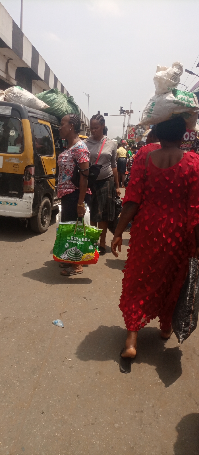 The image displays a bustling urban street scene in Nkpor, Nigeria, under bright, possibly hazy, daylight conditions. The paved ground, a light gray asphalt, shows distinct shadows. In the foreground, a person, largely out of frame, walks away from the camera; their right bare foot, wearing a black flip-flop, is visible. This individual is clad in a voluminous, textured red dress and carries a dark, patterned bag in their left hand. A small, crumpled light blue plastic item lies on the ground near this person's shadow. To the mid-left, a woman with dark braided hair stands or walks in profile, facing left. She wears a short-sleeved top with a red, white, and blue floral pattern, a dark lower garment, and a black bag slung over her left shoulder. She carries a large, bright green shopping bag in her left hand, which features "SUPER KILL MOSQUITO COIL" branding and a spiral mosquito coil graphic. Adjacent to her is the rear of a yellow and black minivan or small bus, its roof laden with multiple large sacks, including one white and one green. The vehicle's white bumper is partially visible. Slightly behind the woman in the floral top, another woman with dark braided hair walks forward, looking downwards. She wears a long-sleeved light grey hooded top, a dark skirt (possibly plaid), and has a red strap crossing her chest. In the background, on the left, an elevated concrete structure with black and white horizontal stripes is visible. To the right, traffic lights are present, indicating an intersection. The deeper background reveals additional indistinct figures, some balancing items on their heads, along with blurred outlines of buildings, consistent with a market or commercial zone. The sky is bright and appears overcast or hazy.