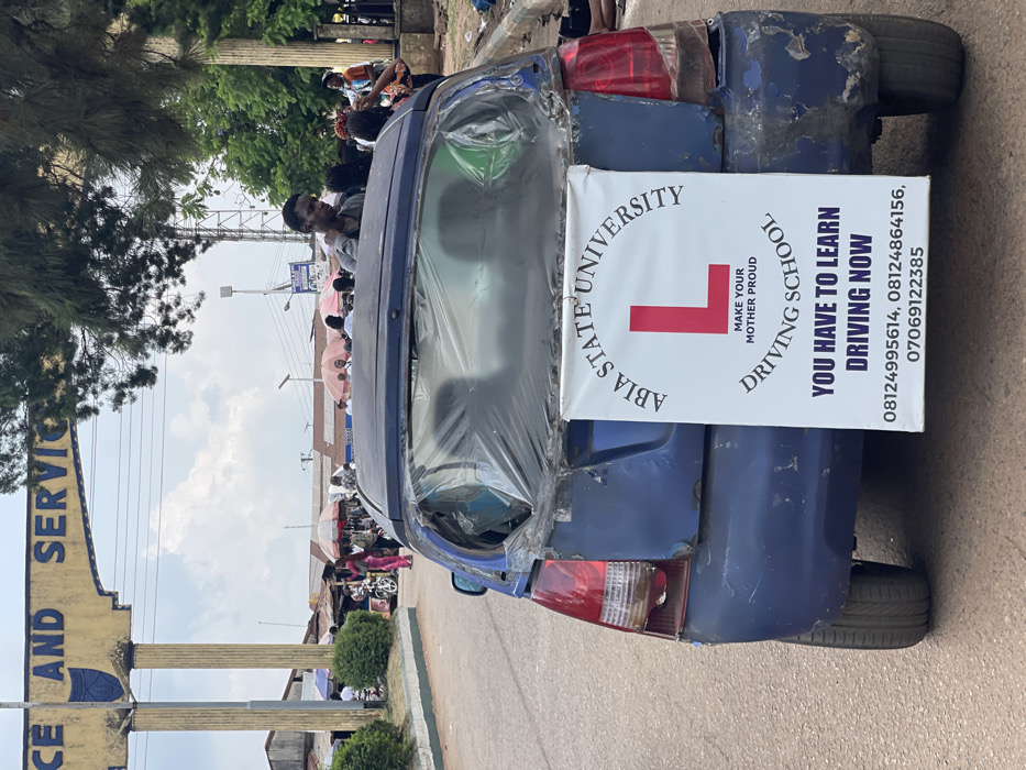 The image depicts a blue, damaged hatchback vehicle positioned on an asphalt road. A large white banner is affixed to the rear of the car, displaying "ABIA STATE UNIVERSITY" in an arc, a prominent red 'L' symbol, "MAKE YOUR MOTHER PROUD", "DRIVING SCHOOL", and "YOU HAVE TO LEARN DRIVING NOW", followed by three contact telephone numbers. The vehicle's rear window is absent, replaced by transparent plastic sheeting crudely taped to the frame. The rear bumper exhibits significant scratches, dents, and areas of rust. The driver's side taillight housing is cracked, and a portion of its red lens is missing. The scene is situated at what appears to be an entrance or gate, indicated by a prominent yellow and blue archway visible in the background with partial text "CE AND SERVIC" and a crest. This identifies the location as Abia State University in Uturu, Nigeria. Numerous individuals are visible in the background, consistent with a bustling market or public thoroughfare. Several makeshift stalls with umbrellas are present. A young male with dark skin, wearing a grey shirt, stands directly behind the damaged vehicle, looking to the left. Other people are partially visible near the vehicle and further in the background. The sky is overcast. To the left of the road, a concrete curb borders a patch of green foliage. Trees are visible on both sides of the roadway.