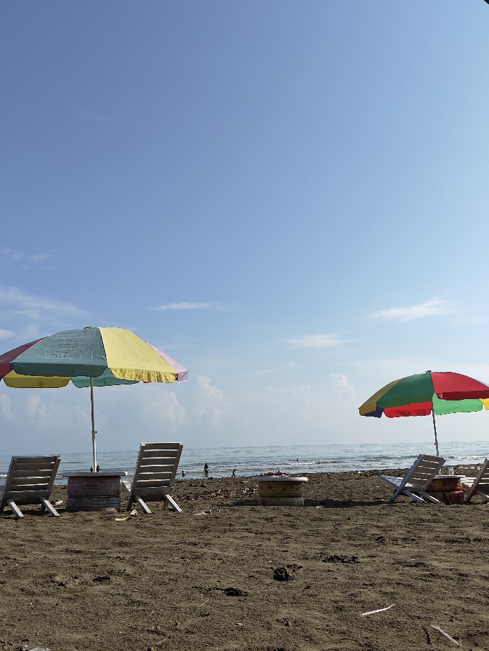 The image displays a beach scene in Reudeuep, Indonesia. The sky, occupying the upper two-thirds of the frame, is clear blue with sparse white cumulus clouds. The horizon separates the sky from the light blue-green ocean, which features moderate waves. The foreground consists of dark brown, sandy beach terrain with minor scattered debris. Two distinct leisure setups are positioned on the sand. On the left, a beach umbrella with segments of yellow, light blue, and pink fabric is erected. Beneath it, two light-colored wooden slatted beach chairs face the ocean, flanking a low table constructed from stacked, painted tires with a flat, light-colored top. On the right, a second beach umbrella with red, green, and yellow fabric segments is visible, similarly shading two light-colored wooden slatted beach chairs and another identical tire-constructed table. In the mid-ground, at the ocean's edge and within the water, multiple small, dark human figures are discernible. These individuals appear to be wading, swimming, or standing in the shallow surf. No direct interactions between the figures in the water or between them and the beach setups are clearly identifiable. The overall environment suggests recreational activity on a sunny day.