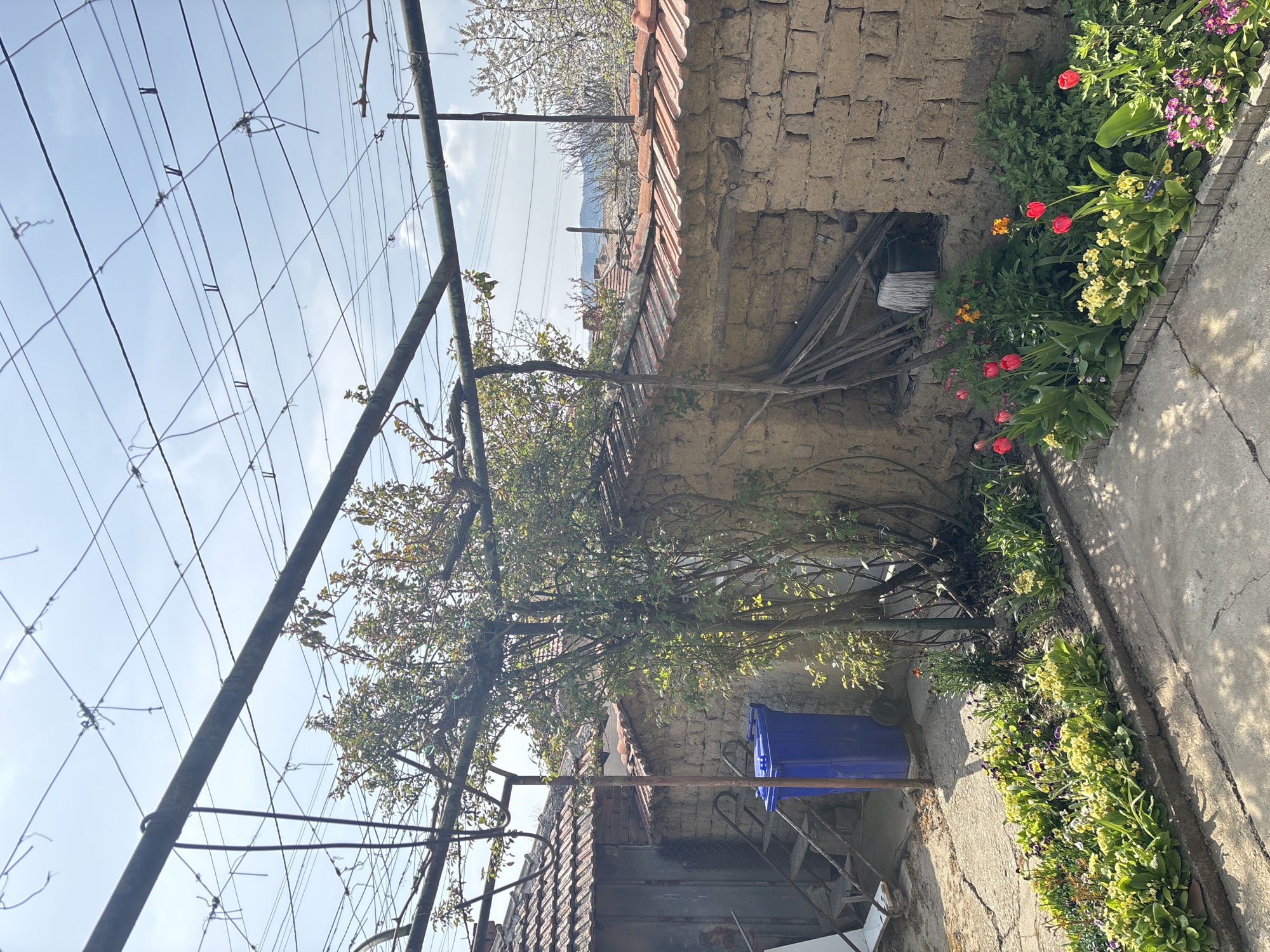 The image presents an outdoor scene in what appears to be Banya, Bulgaria, characterized by a combination of natural and man-made elements. In the foreground, a metal structure, possibly a framework for vines, dominates the view, its support wires creating a lattice against the sky. Behind it stands an old, crumbling wall constructed of irregular, light-colored stones or bricks. A small, rectangular opening is visible in the wall, housing wooden scraps and a white object. A vibrant array of flowers, including red tulips, line the top edge of the wall and extend along a paved walkway on the right side of the image. In the background, a tree with budding leaves is visible, alongside a blue trash can sitting on a set of metal steps. The general atmosphere of the scene is one of a rustic garden setting. The lighting is bright, suggesting a sunny day.