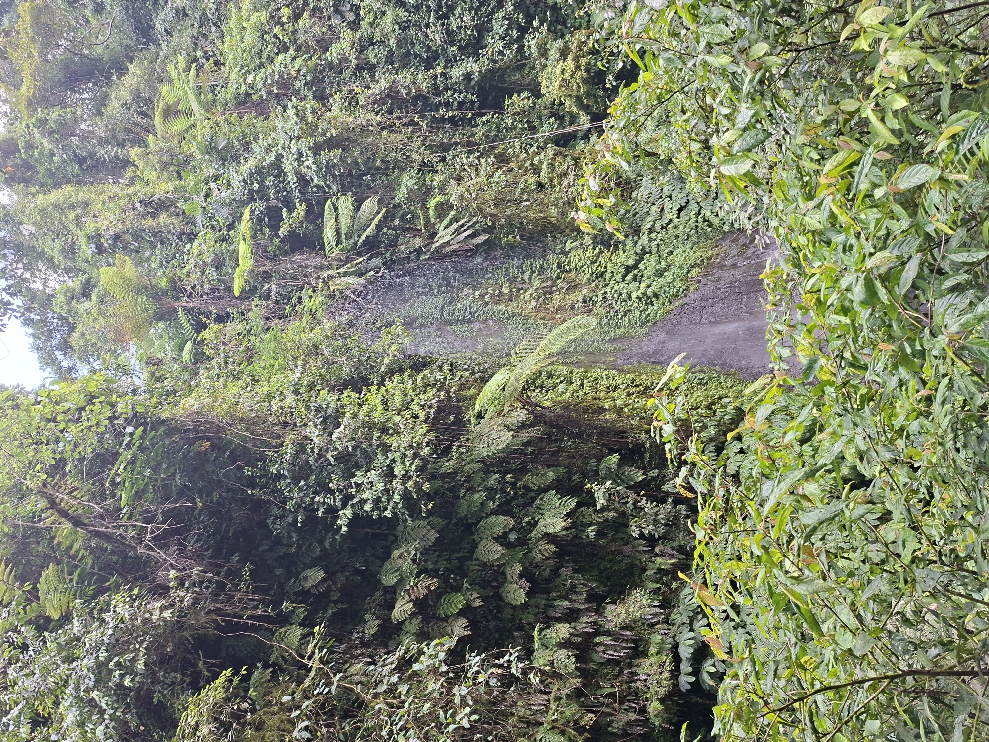 lush, green environment, possibly a rainforest or jungle. The scene is characterized by dense vegetation, including trees, ferns, and various plants. There is a narrow strip that appears to be a small waterfall or a stream flowing through the vegetation. The photo's location is in the city of Petang, Indonesia. The environment is likely moist and humid, as suggested by the prevalence of greenery. No people or animals are visible in the image.